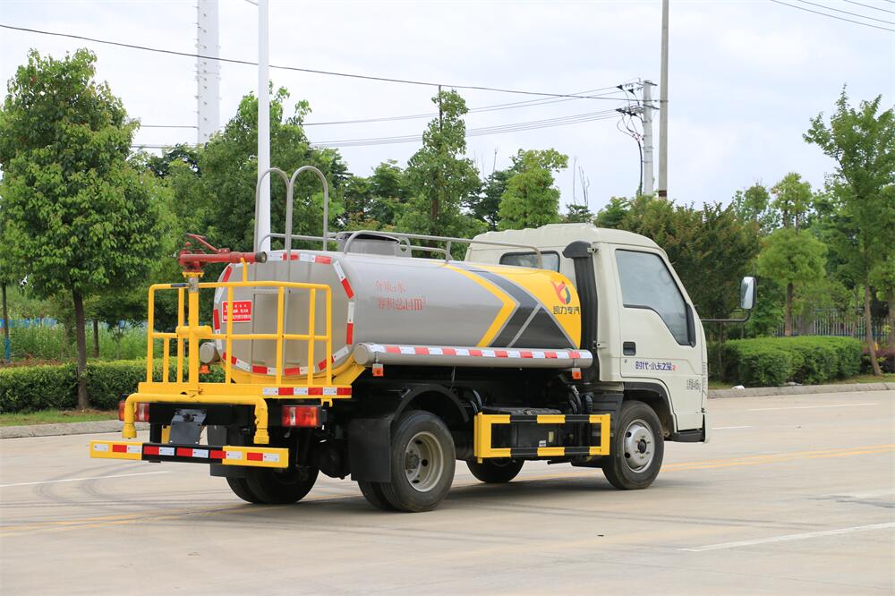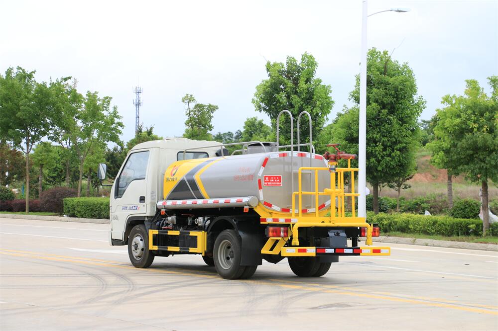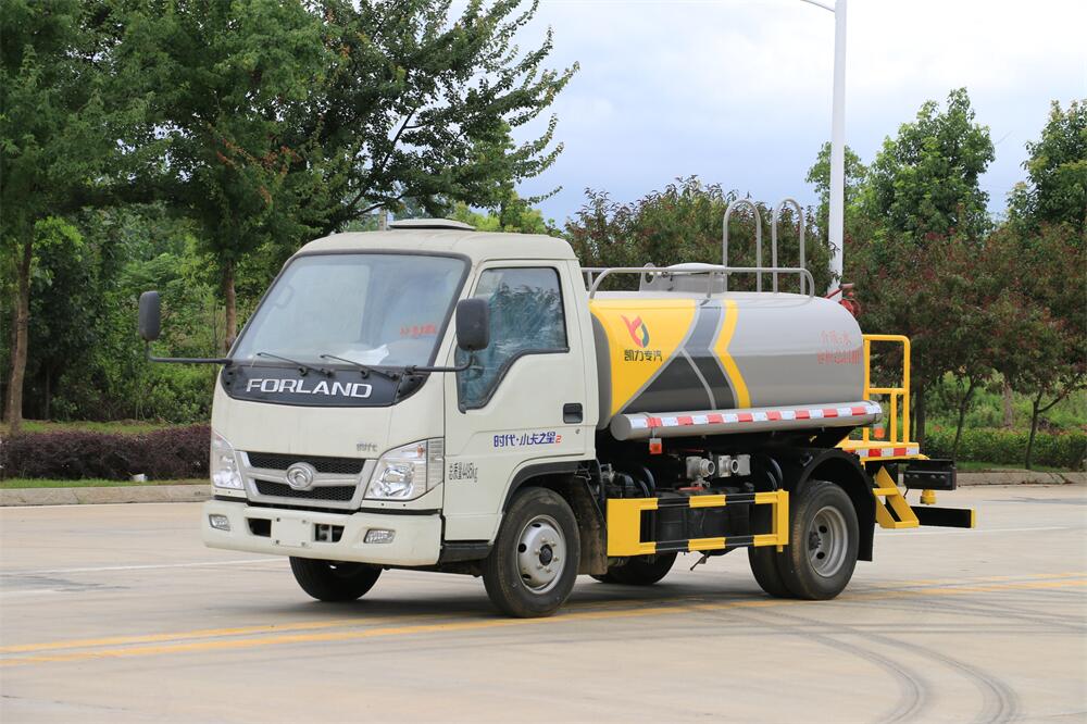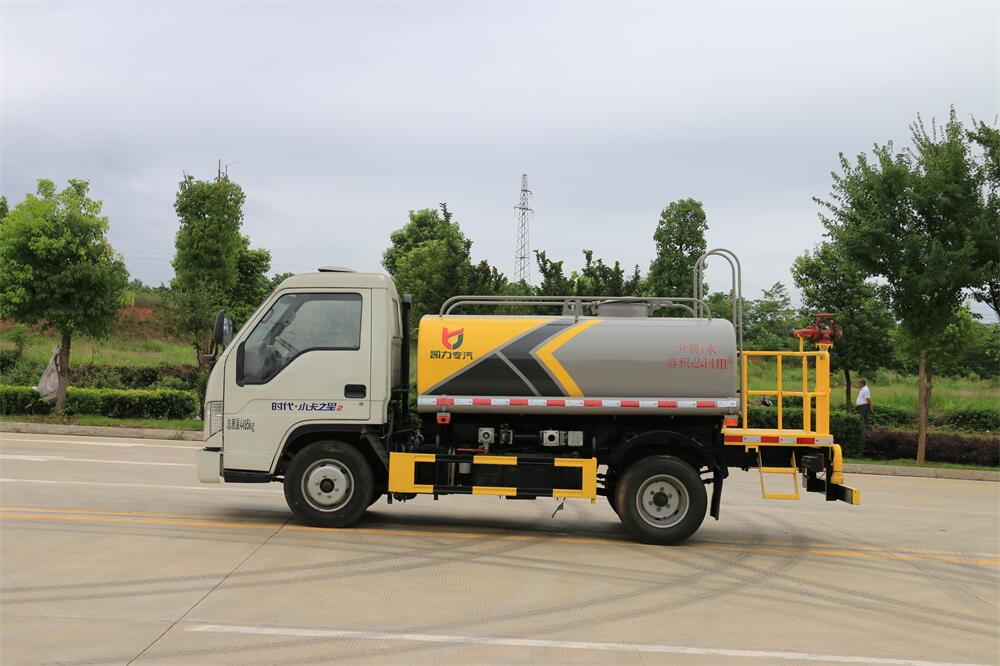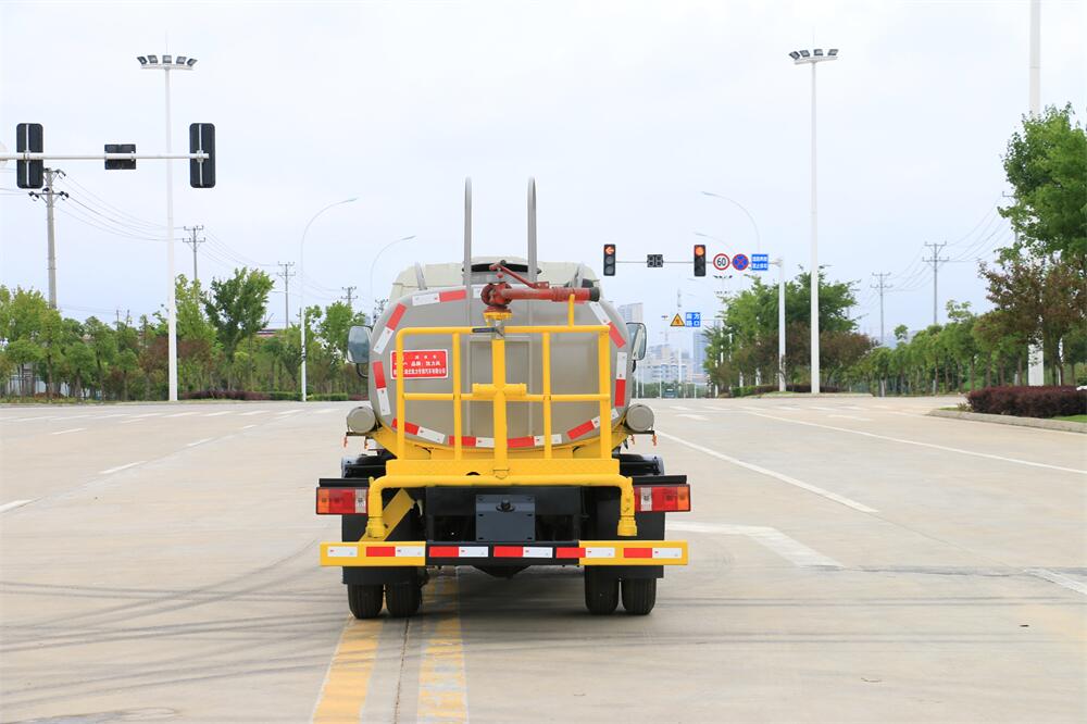 灑水車前裝有鴨形噴嘴或圓頭沖嘴,后面裝有圓柱開(kāi)灑水噴嘴或蓮蓬頭噴嘴,后部有一工作平臺(tái),裝配有水炮。后部還可裝8個(gè)噴嘴(選裝)。