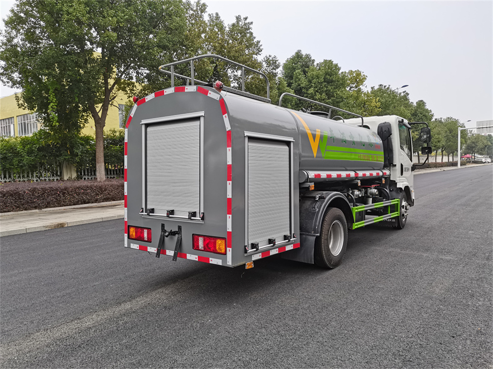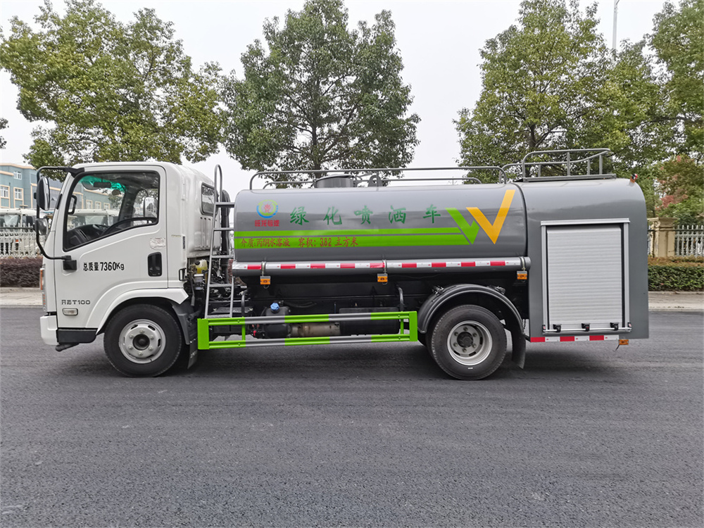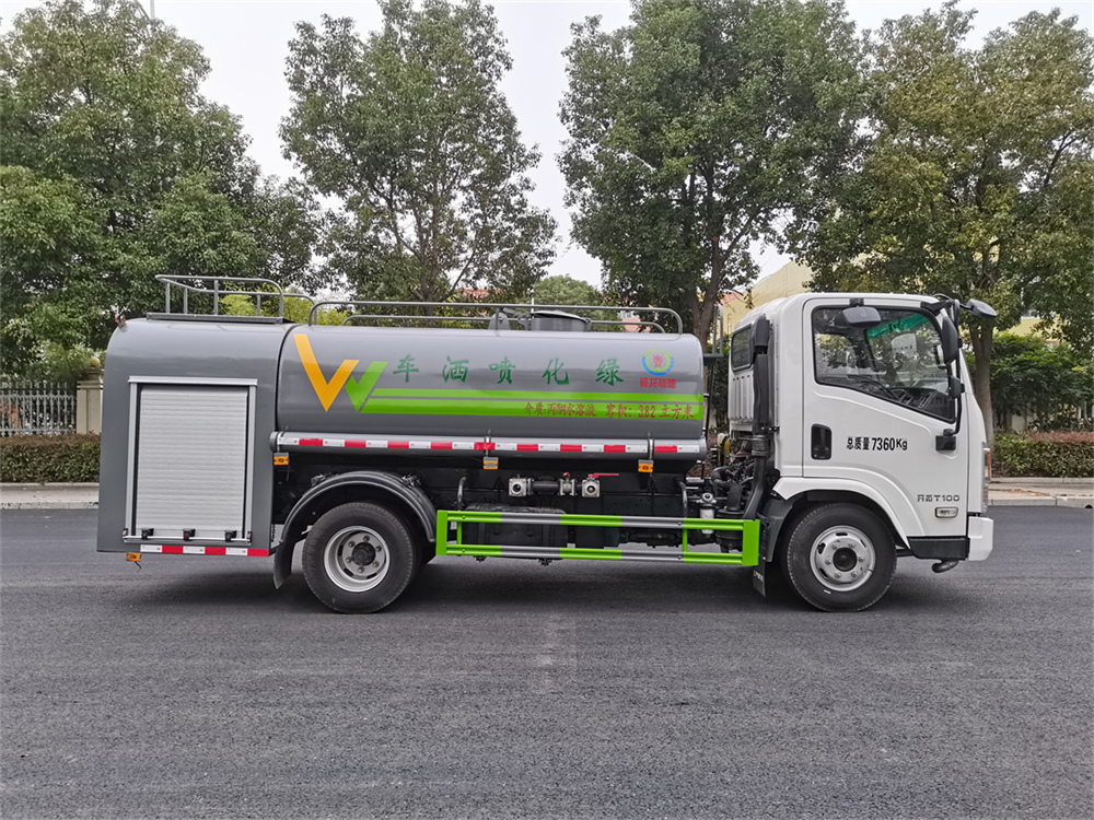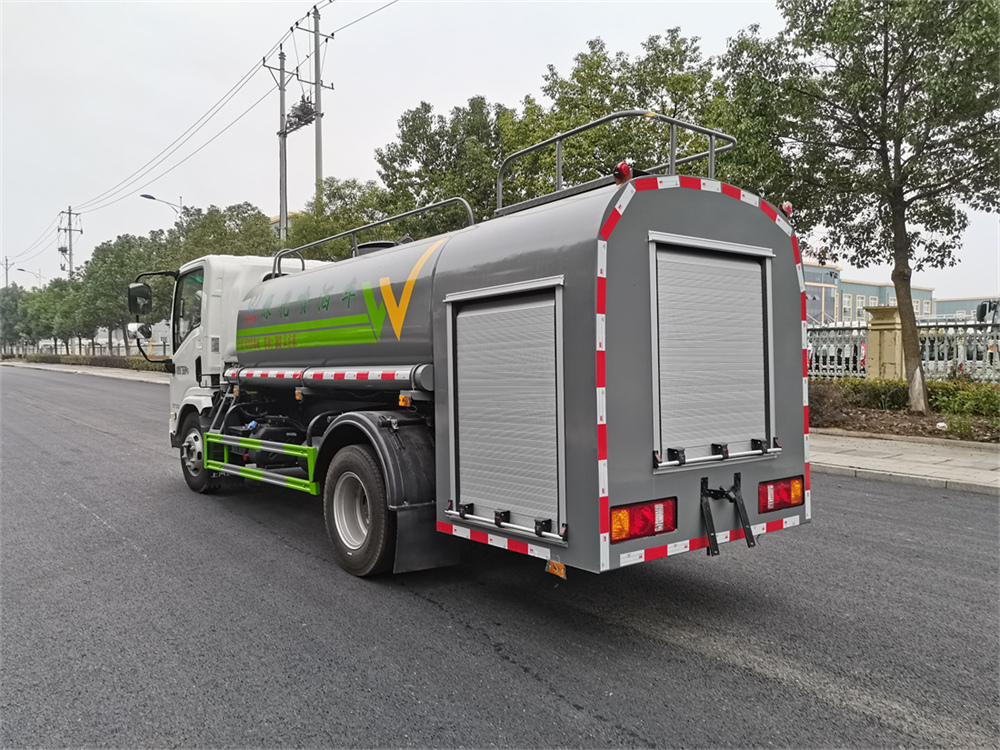 灑水車前裝有鴨形噴嘴或圓頭沖嘴,后面裝有圓柱開(kāi)灑水噴嘴或蓮蓬頭噴嘴,后部有一工作平臺(tái),裝配有水炮。后部還可裝8個(gè)噴嘴(選裝)。