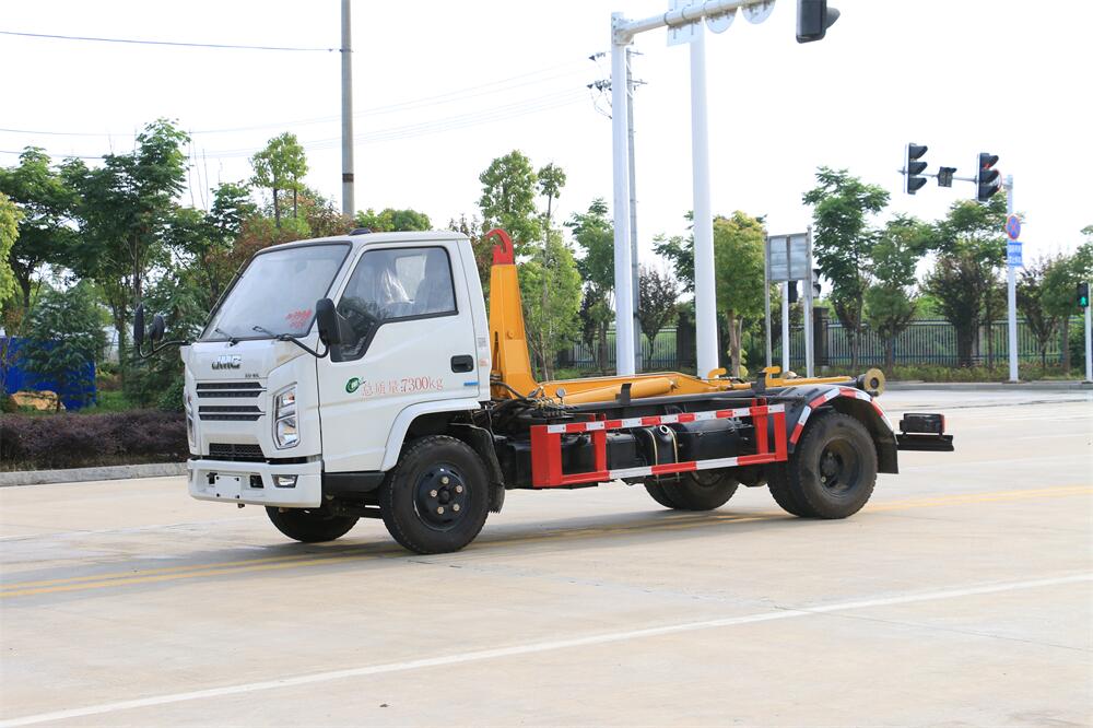 該款鉤臂式垃圾車由液壓系統、操作系統組成。舉升油制缸(1支)系國內知名液壓件廠家生產的雙作用油缸。垃圾廂可自吊上放下,可自行傾倒垃圾,上下一次工作循環時間≤50S。該車的特點是一個車能配多個垃圾廂,能實現一臺車與多個垃圾廂聯合作業,循環運輸,充分提高了車輛的運輸能力。