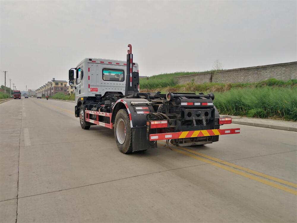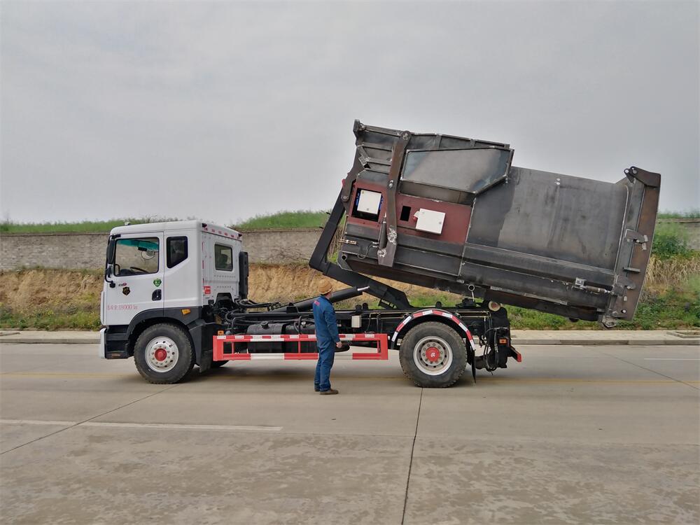 該款鉤臂式垃圾車由液壓系統(tǒng)、操作系統(tǒng)組成。舉升油制缸(1支)系國內(nèi)知名液壓件廠家生產(chǎn)的雙作用油缸。垃圾廂可自吊上放下,可自行傾倒垃圾,上下一次工作循環(huán)時間≤50S。該車的特點是一個車能配多個垃圾廂,能實現(xiàn)一臺車與多個垃圾廂聯(lián)合作業(yè),循環(huán)運輸,充分提高了車輛的運輸能力。
