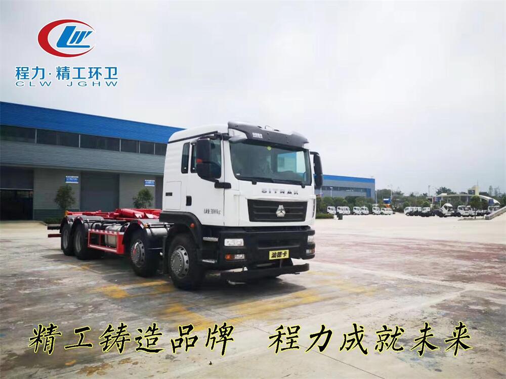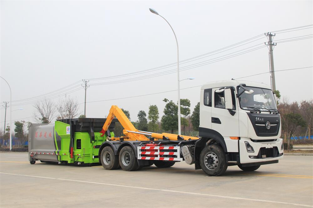 勾臂式垃圾車(車廂可卸式垃圾車)介紹: 車廂可卸式垃圾車又叫拉臂式垃圾車,是一種采用高新設計可伸縮的鉤臂,實現垃圾廂的二次吊裝,自吊上放下,可自行傾倒垃圾的環衛設備。 拉臂式垃圾車結構簡單,操作穩定方便,裝卸效率高,機械化程度高,節省人力。鉤臂垃圾車一車可帶多個垃圾廂,在裝卸的運輸過程中可有效地避免二次污染。 拉臂垃圾車采用高新設計可擺動的鉤臂,垃圾箱由框架、開啟油缸、滑輪、后門和若干加強框架與鋼板焊接而成。調換貨廂快捷方便,貨廂上帶蓋(倒垃圾時可翻開),鉤臂垃圾車垃圾廂體可選用碳鋼、不銹鋼材質、內部采取環氧樹脂防腐處理,改裝部分與原車底盤為可分離式,維修方便且保持了原車的機動性及行駛性能。
