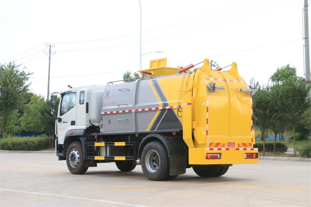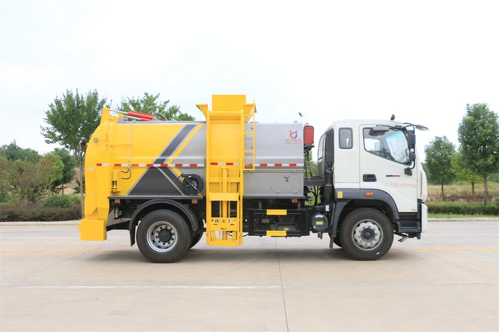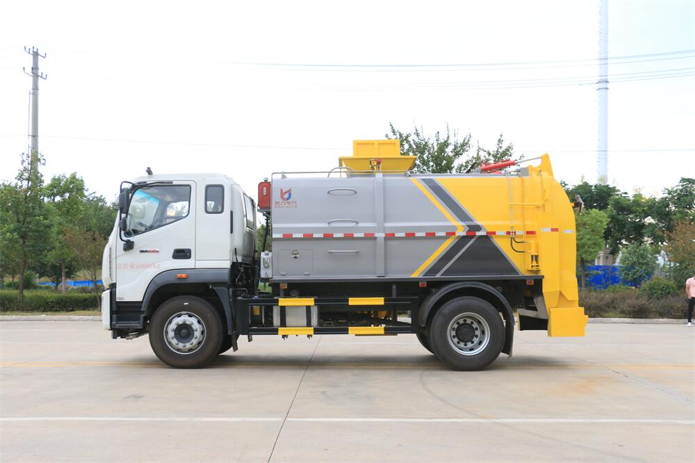 上裝配置:罐體容積10m3,配備120L/240L掛桶提升翻轉機構,液壓系統,后蓋液壓鎖緊開啟,罐體可以舉升自卸,尾部帶自流閥;用于運輸液態垃圾,其特點操作簡單,密封性好,無泄漏,無異味;可選裝固液分離功能,推板擠壓功能,常用于餐館的垃圾轉運處理。
