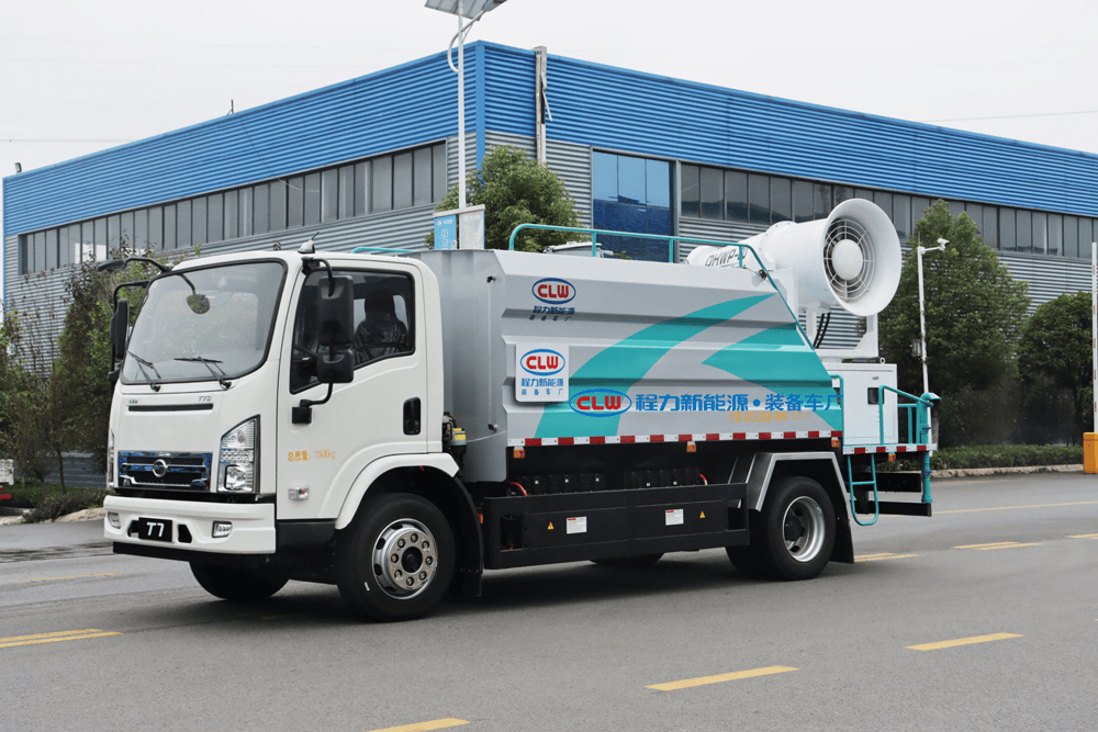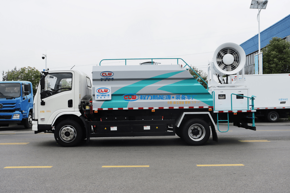 上裝配置:罐體容積為 16立方,選配風送式霧炮機組射程30米、40米、50米、60米、80米、100米、120米霧炮,罐體鋼板為4mm碳鋼Q235材質,罐內隔板具有防波作用,以減輕汽車行駛時罐體液體沖擊,罐體及整車外形尺寸按照公告。帶大功率專用灑水泵,泵可自吸自排,整車前沖、后灑、側噴、帶65消防接口,后平臺配CLW-50、CLW-60、CLW-80、CLW-100、CLW-120型風送式霧炮機組;罐體前封頭配大功率柴油發電機組;前封頭帶水位計,后平臺主管路帶1寸澆花接口,后爬梯。帶兩根輸水管及陰陽端。罐體顏色:銀/灰/綠,罐體兩側噴“多功能抑塵車”字樣,貼反光標示。