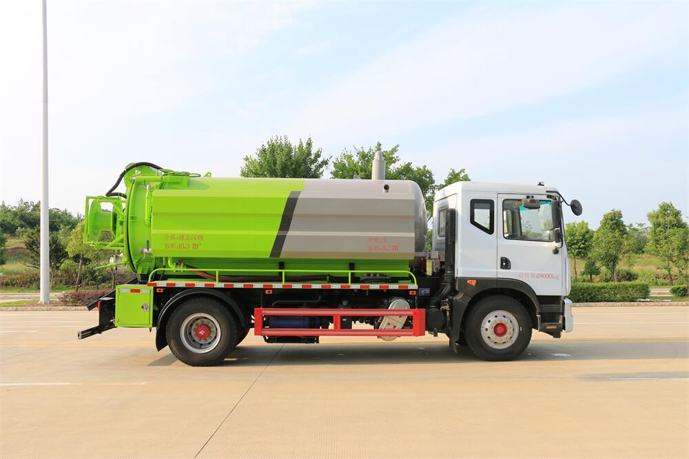 上裝配置:上裝配置:水罐4 立方,污罐 8立方;清洗 部份采用天津通潔,壓力 24Mpa,流量 215L/min,配80米直徑22高壓管帶液壓卷盤; 吸污部份采用山東 SK-15 水循環泵(億豐 10T 雙聯想真空泵),吸污罐帶舉升,后蓋液壓開 啟,帶一個 600mm 快開,罐體后尾部一個 DN150 排污口球閥,一個 DN100 進污口球閥,一個視 污窗,一根 10m 吸污管,一套陰陽端,壓力 表,防溢閥,箭頭燈,淋管裝置,高壓泵帶氣 吹水。配一個 4.5 公斤水雷噴頭,另帶一個 80 公分手持洗車噴頭。