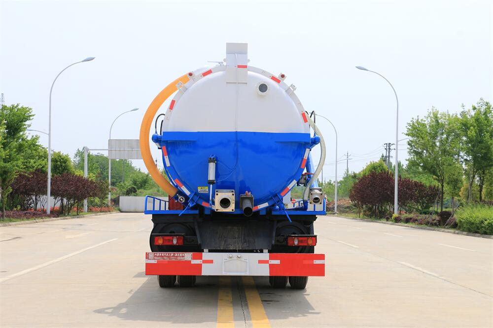 上裝配置:清水罐約 5 立方,污水罐約 10 立 方;罐體 8mm 厚,封頭 8mm 厚,水罐、污罐可 互通,用 100 球閥**開關;清洗部份采用天 津通潔高壓泵,壓力 19Mpa,流量 215L/min, 配 80 米直徑 22 高壓管帶液壓卷盤;吸污部份 采用濰柴375馬力副發(fā)動機帶山東SK-30水循 環(huán)泵(副發(fā)自帶),吸污罐帶舉升,后封頭焊 死(可選擇后封頭全開),尾部加裝一個 600mm 快開,罐體后尾部一個 DN150 排污口球閥,一 個 DN100 吸污球閥帶出口盤,一個視污窗,一 根 10m 吸污管,一套陰陽端,壓力表,防溢 閥,箭頭燈,工具箱,淋管裝置,高壓泵帶氣 吹水。配一個 4.5 公斤水雷噴頭,另帶一個 80 公分手持洗車噴頭。
